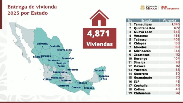 A lo largo de 2025, el programa «Vivienda para el Bienestar» contempla la entrega de un total de 4,871 casas en 39 municipios de 19 estados de la república mexicana. Específicamente, en Tamaulipas, se tiene proyectada la entrega de mil 395 unidades habitacionales este mismo año. Esta cifra es la que posiciona a la entidad por encima de otros estados con alta densidad poblacional. Los beneficiarios en la región podrán contar con un techo seguro y digno.