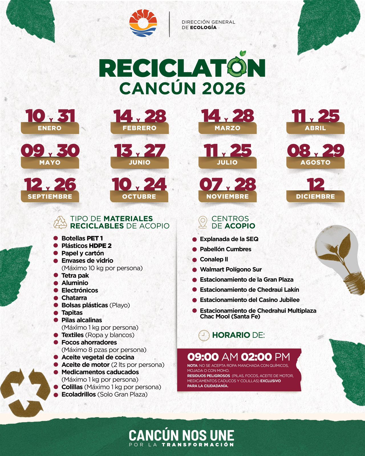 Se hace una cordial invitación a todos los ciudadanos que ya cuentan con sus materiales debidamente separados y limpios para que asistan a cualquiera de los centros de acopio. El horario de atención para este reciclaje en Cancún será de las 9:00 de la mañana hasta las 2:00 de la tarde. Es fundamental que la población respete estos horarios para facilitar la logística de recolección y el traslado adecuado de los materiales hacia sus destinos finales de procesamiento.