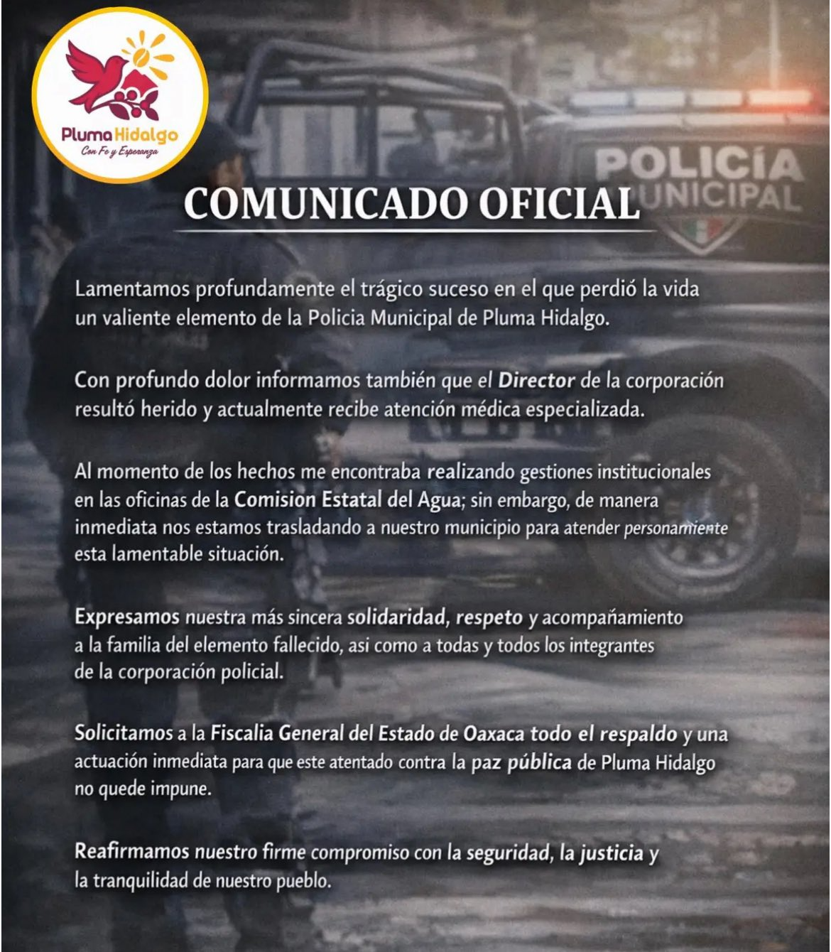 Ante la gravedad de los hechos, el alcalde Israel Roel Ramírez hizo un llamado urgente y enérgico a las autoridades estatales y federales para evitar que este acto quede en el olvido. El edil solicitó que el suceso armado en la comunidad sea investigado a fondo para dar con los responsables materiales e intelectuales lo antes posible. La petición del mandatario municipal subraya la necesidad de reforzar la presencia de las fuerzas del orden para devolver la sensación de seguridad a las familias de Pluma Hidalgo.