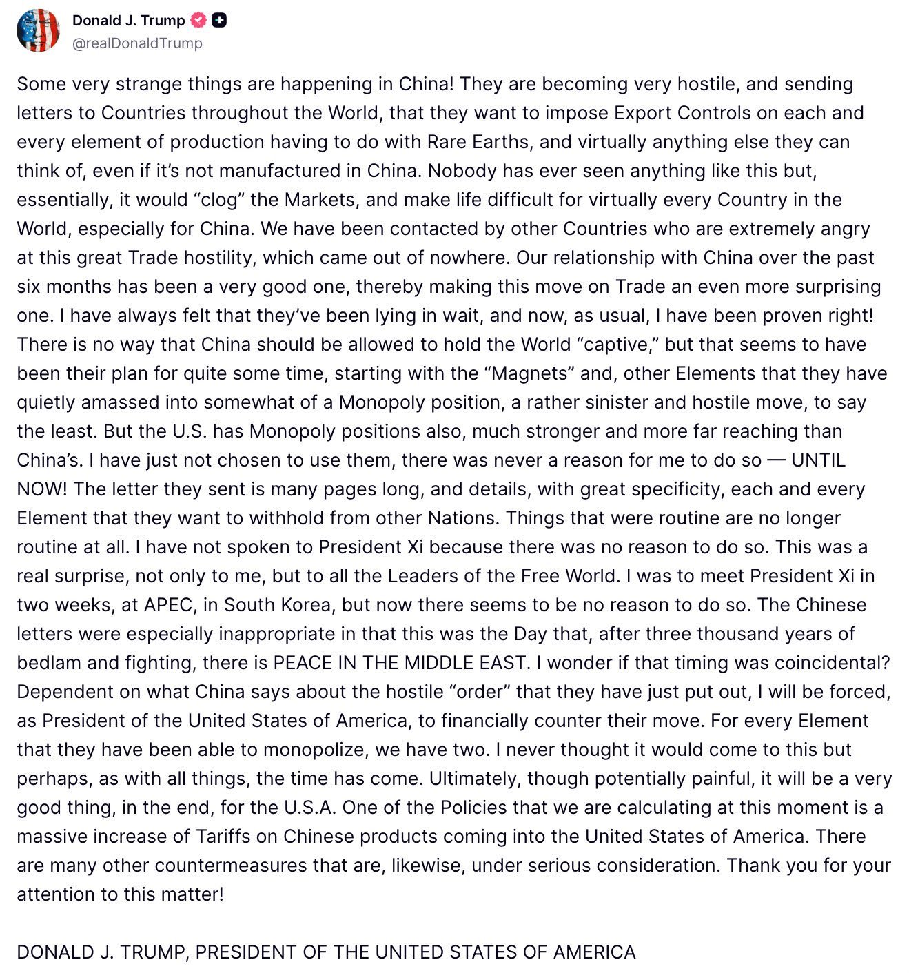 Ante la «orden hostil» de China, Trump advirtió que Estados Unidos posee «posiciones de monopolio, mucho más sólidas» que las de China y que, aunque nunca había optado por usarlas, «¡hasta ahora!» podría hacerlo. El presidente lamentó que la acción china haya arruinado su plan de reunirse con el presidente Xi Jinping en la cumbre de la APEC en Corea del Sur en dos semanas, afirmando que «ahora parece que no hay motivo para hacerlo».