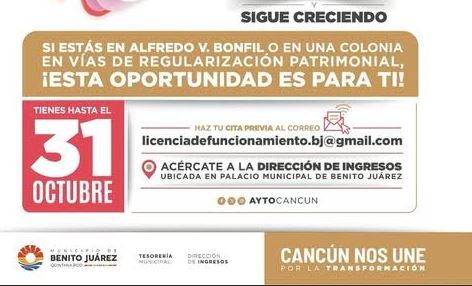 Cancún, Q. R., 28 de octubre de 2025.- El Ayuntamiento de Benito Juárez, a través de la Dirección de Ingresos, informó que esta es la última semana para que los ciudadanos de la delegación Alfredo V. Bonfil y de colonias en vías de regularización patrimonial puedan tramitar su permiso provisional 2025 por primera vez. La fecha límite es el próximo viernes 31 de octubre.