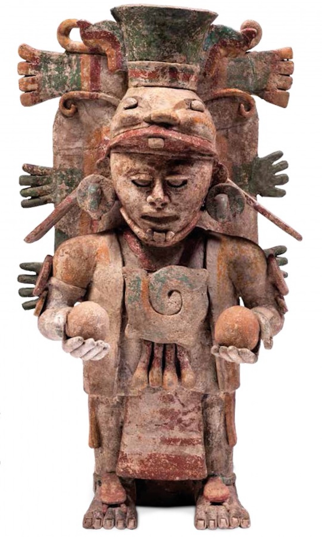 Y en la parte final de su cuerpo brota, de un círculo de pétalos o plumas, una cabeza esculpida de serpiente.