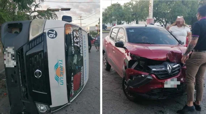 5 de Enero del 2026.- La mañana del viernes 2 de enero, la ciudad de Cancún fue escenario de un aparatoso incidente vial que movilizó a los cuerpos de emergencia. El reporte oficial indica que los hechos ocurrieron alrededor de las 7:30 horas, justo en la intersección de la avenida Diagonal Tulum con la avenida 20 de Noviembre. En este punto, dos vehículos particulares se vieron involucrados en un fuerte choque que terminó con una de las unidades volcada sobre el pavimento.