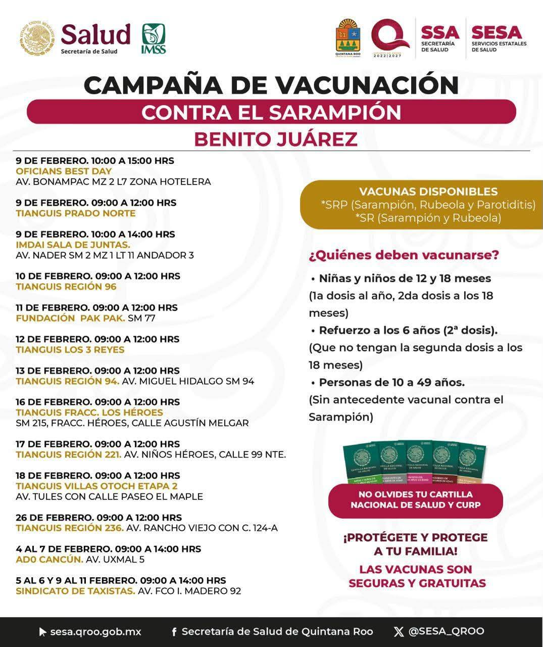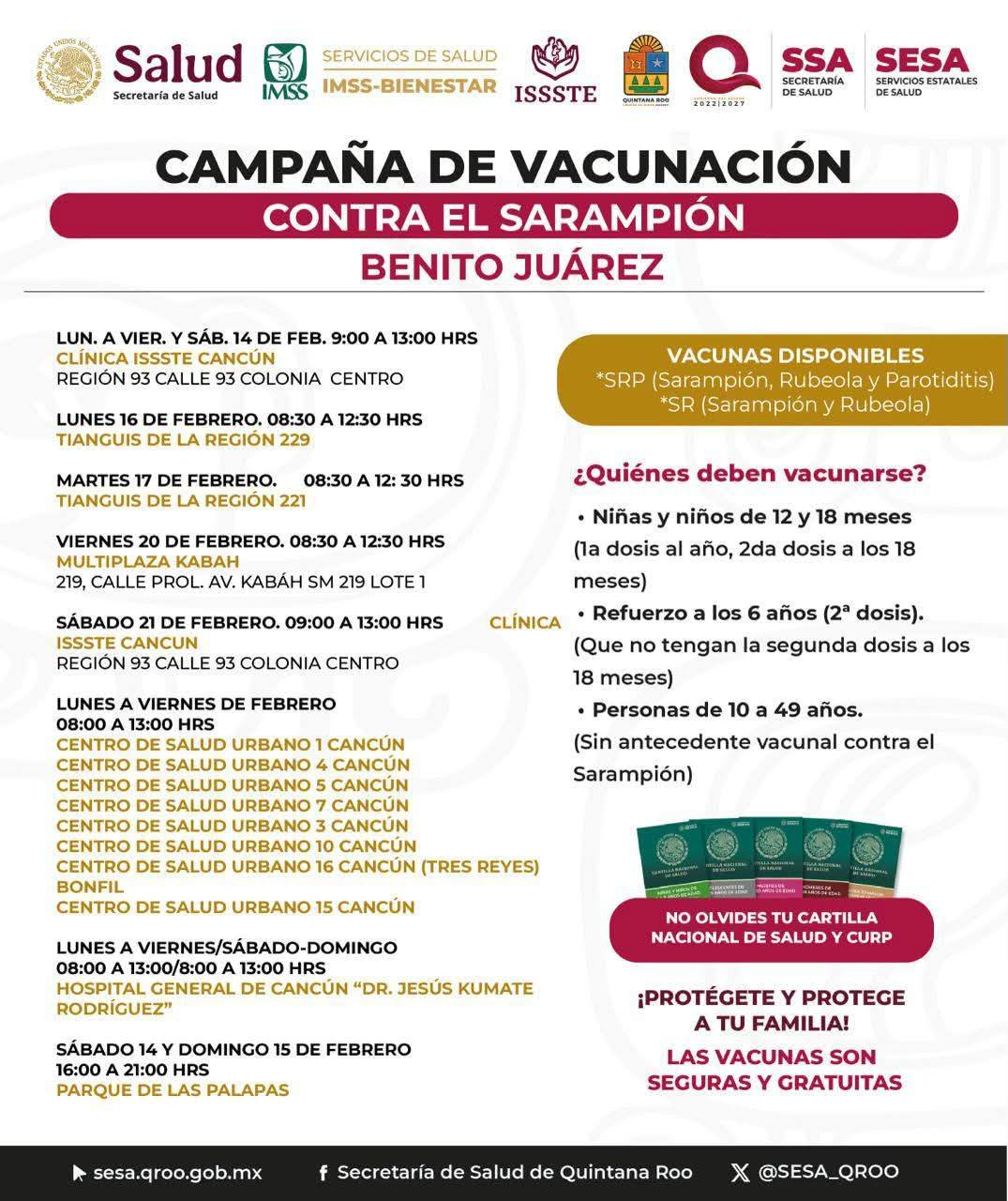 Las autoridades informaron que la vacuna contra el sarampión se aplica de lunes a viernes en la Plaza de la Reforma del Palacio Municipal, en horario de 09:00 a 14:00 horas. También está disponible en el Hospital General “Jesús Kumate Rodríguez” y en todos los Centros de Salud de 07:00 a 14:00 horas. Además, los módulos itinerantes recorren los tianguis de las Supermanzanas 94, 102, 221, 227, 228, 229, 233, 236 y 239 en turnos matutino y vespertino.