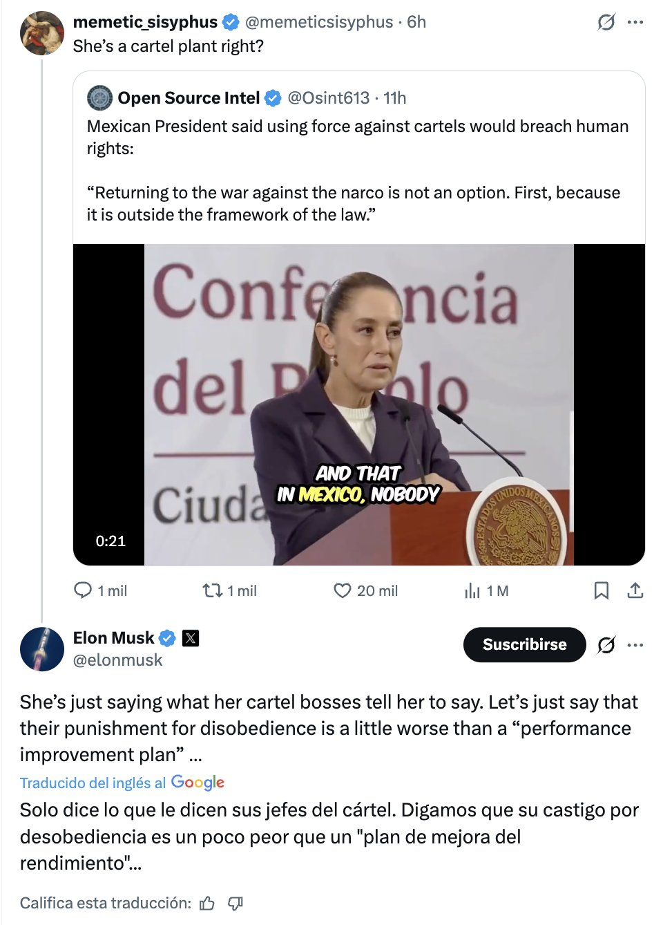 La mandataria señaló que, más allá de las polémicas que suelen generarse en redes sociales, su principal enfoque es mantener la estabilidad y el respeto mutuo. En sus declaraciones, enfatizó que para ella lo más importante es «lo que dice el pueblo», poniendo el sentimiento ciudadano por encima de cualquier intercambio de palabras con el dueño de X (antes Twitter). Este posible proceso jurídico busca sentar un precedente sobre cómo deben manejarse las relaciones entre grandes empresarios tecnológicos y los jefes de estado, bajo un marco de respeto y legalidad.