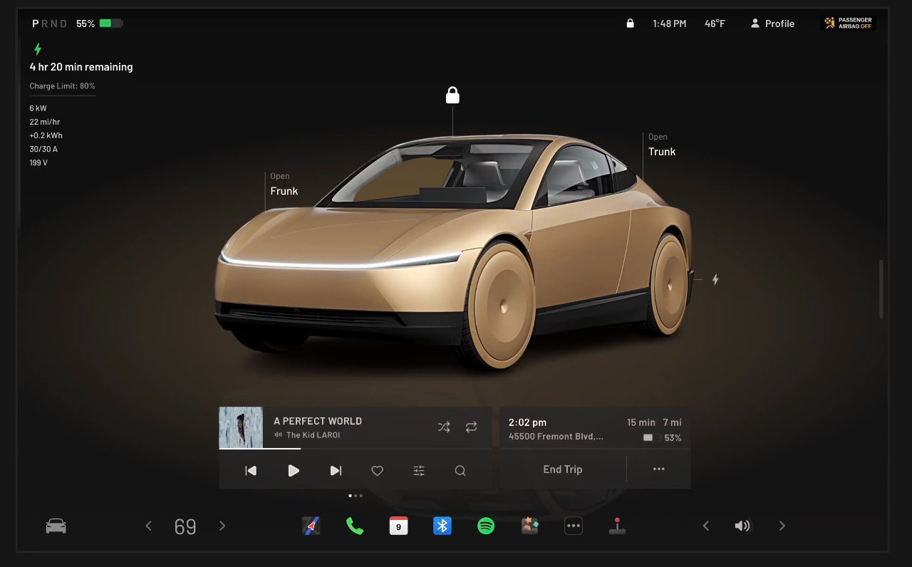Además, el Tesla Cybercab introduce una novedad muy importante en su sistema de energía: la carga inalámbrica por inducción. Esto significa que el coche no necesita ser enchufado manualmente a una toma de corriente; simplemente se estaciona sobre una plataforma especial y comienza a cargar su batería. Esta característica es vital para su funcionamiento como robotaxi, ya que le permite ser autosuficiente durante sus jornadas de trabajo sin ayuda humana.