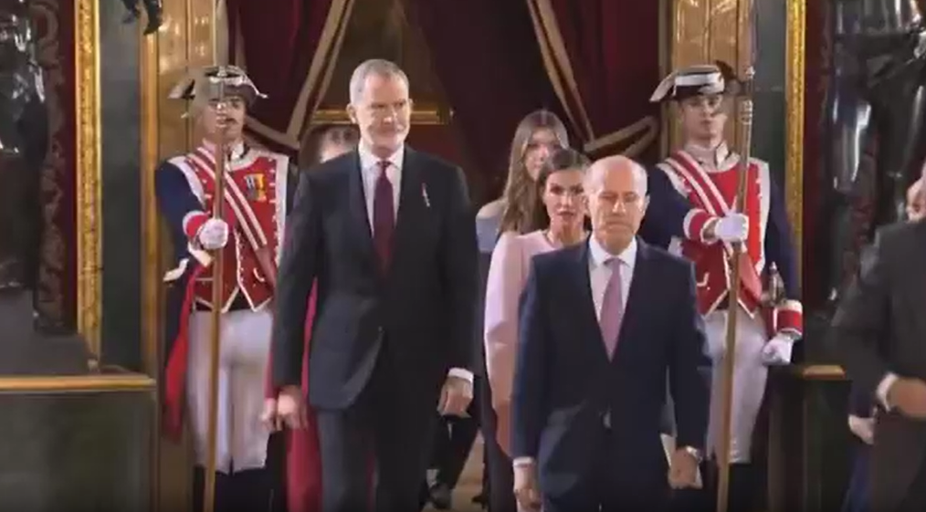 La entrada al Salón del Trono, uno de los espacios más majestuosos del Palacio Real, se ha desarrollado bajo el estricto protocolo que caracteriza a estos eventos. La presencia de los cuatro miembros principales de la Familia Real—los Reyes y sus hijas—busca proyectar una imagen de cohesión y futuro. La Princesa Leonor y la Infanta Sofía observan de cerca la ceremonia, interiorizando el peso de la tradición y la importancia de los símbolos monárquicos.