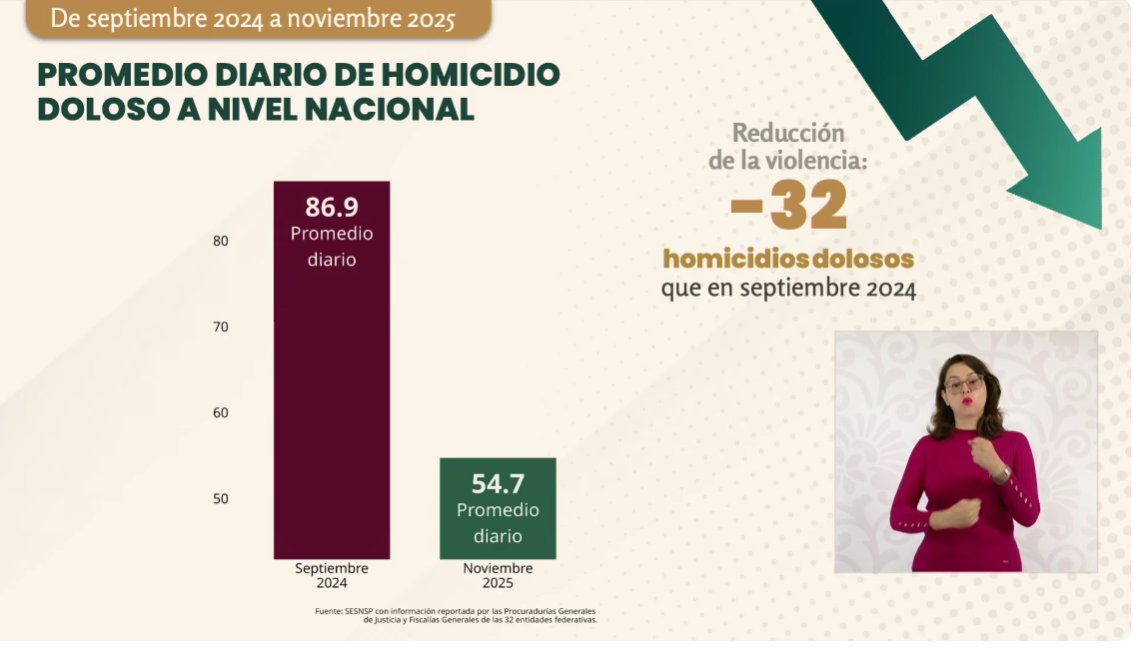 La funcionaria destacó que noviembre de 2025 se consolidó como el mes con la menor incidencia de homicidio doloso registrada en la última década. Este hito es un indicador claro de que la tendencia a la baja en la violencia es sostenida y profunda, alejando al país de las cifras históricas que se observaban en años anteriores. La reducción del homicidio doloso es un pilar fundamental para garantizar la paz y tranquilidad de la población en todo el territorio nacional.