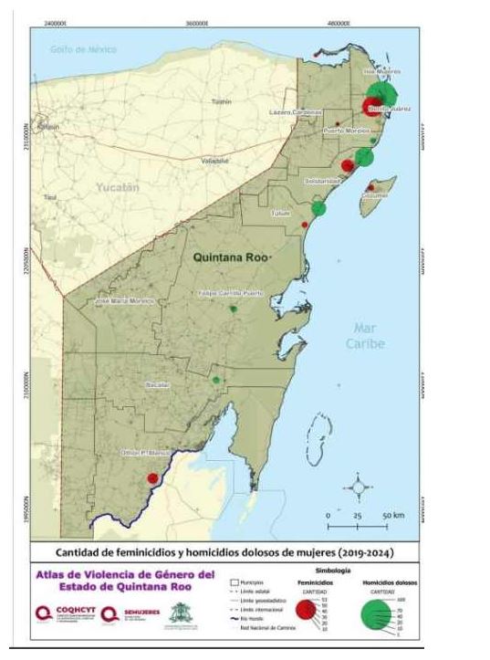 El Atlas, elaborado con cifras oficiales, indica que entre 2019 y 2024 se registraron 431 muertes violentas de mujeres en Quintana Roo. De ese total, 103 casos fueron clasificados como feminicidios y 328 como homicidios dolosos. Tan solo en Tulum se registraron 42 muertes violentas de mujeres durante ese periodo.