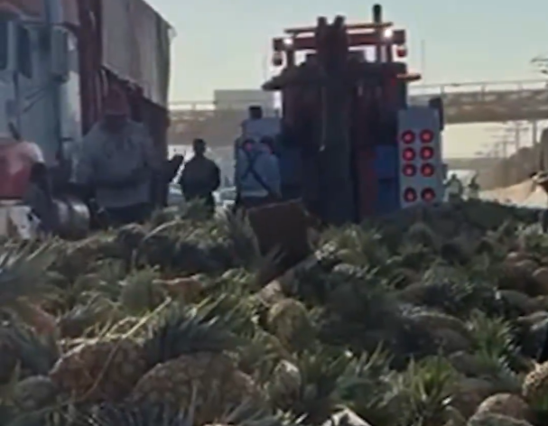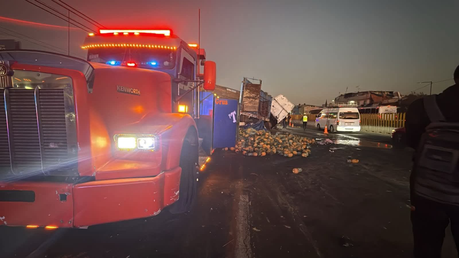 De acuerdo con los reportes de las autoridades, el tráiler que transportaba piña se impactó primero contra el muro de contención antes de quedar recostado sobre el pavimento. Debido a la fuerza del golpe, las toneladas de fruta que llevaba en la caja quedaron esparcidas por todos los carriles centrales, bloqueando el paso de cientos de automovilistas. La mercancía llegó incluso a invadir el carril confinado del Trolebús Elevado, complicando no solo el paso de autos particulares, sino también la operación del transporte público en la zona.