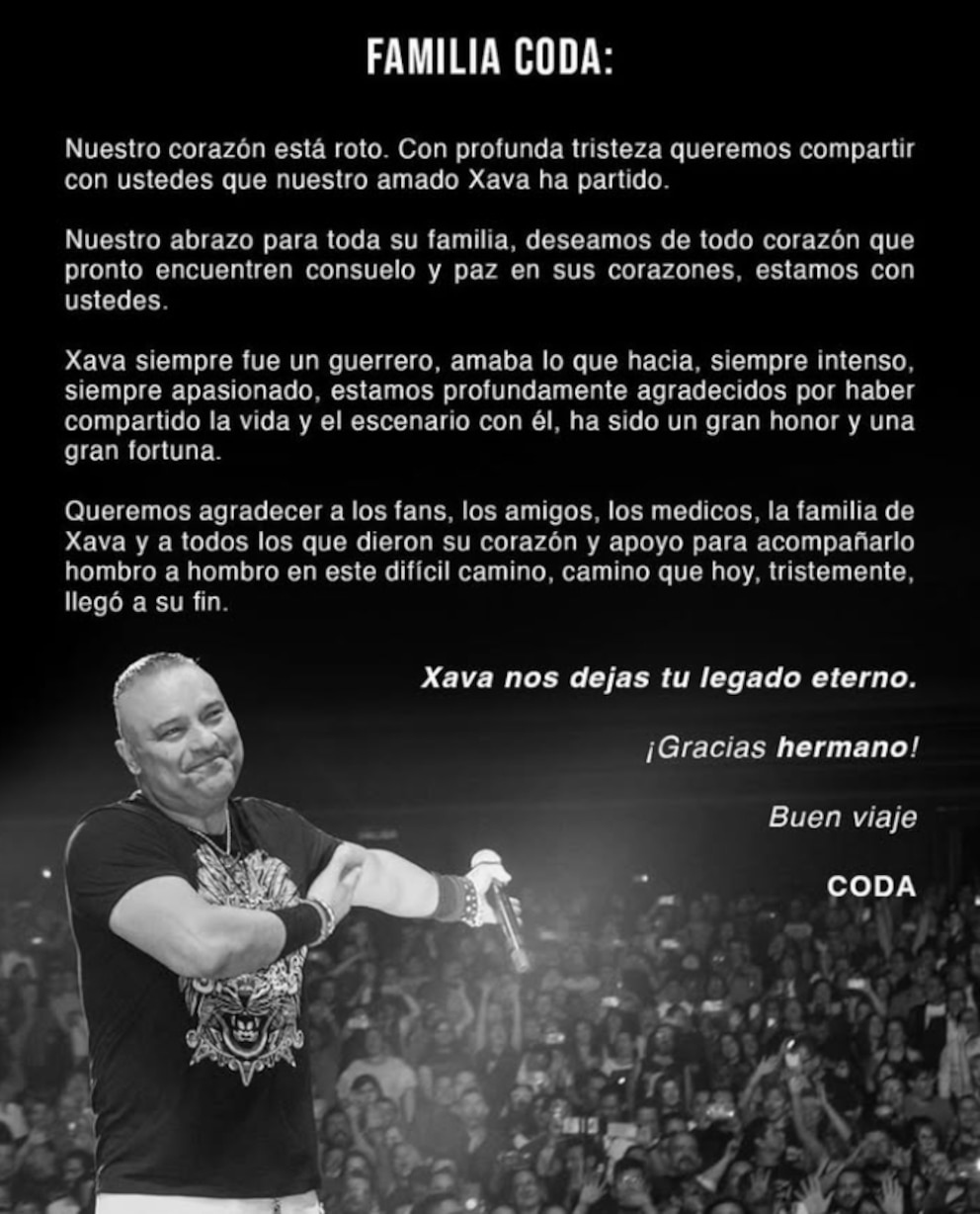 La agrupación lamentó la partida de su compañero con un texto lleno de cariño, recordando su intensidad y pasión por la música. “Nuestro corazón está roto”, expresaron en un comunicado, donde también agradecieron a los fans, amigos y medios por haber acompañado a Xava en su lucha contra la enfermedad. El mensaje generó una ola de reacciones en redes sociales, donde músicos y seguidores expresaron su tristeza y rindieron tributo al cantante.