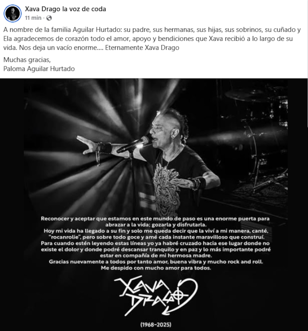 21 de Agosto 2025.- El mundo del rock mexicano se encuentra de luto por la muerte de Xava Drago, vocalista de la banda Coda, quien falleció a los 54 años víctima de un cáncer de estómago que le fue diagnosticado apenas unas semanas atrás. La noticia fue confirmada este 21 de agosto a través de las redes sociales oficiales de la agrupación, acompañada de un mensaje de despedida que conmovió a miles de seguidores.